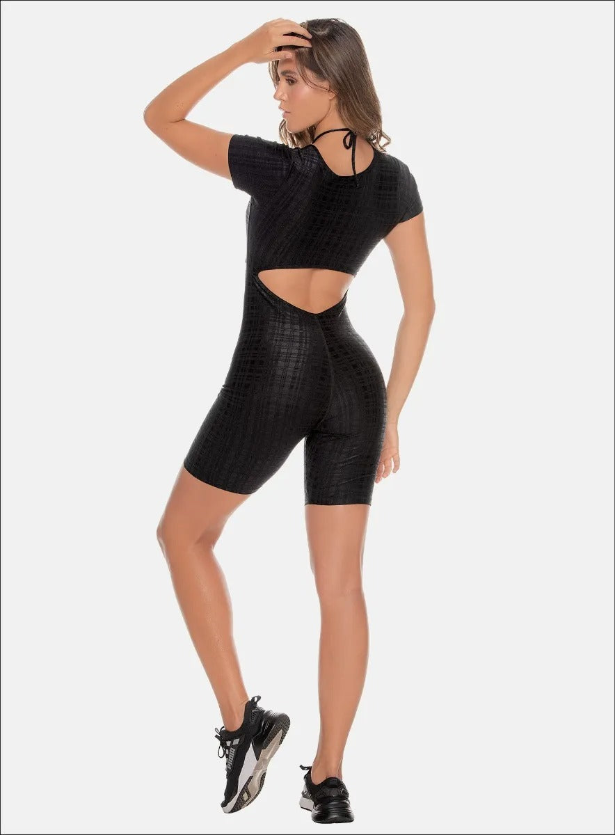 ENTERIZO CORTO DEPORTIVO TELA CON DISEÑO JACQUARD Y EFECTO BRILLO, CON ESCOTE EN FRENTE Y PARTE POSTERIOR
