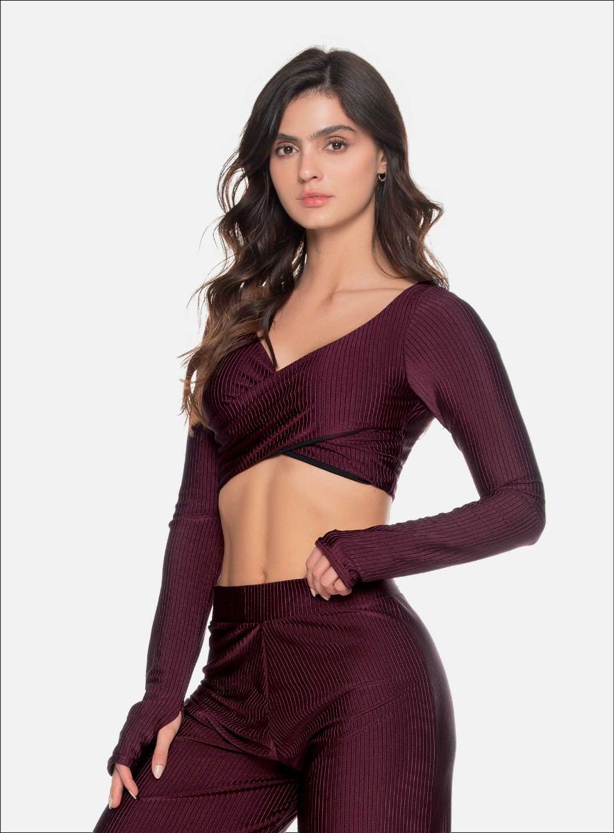 TOP MANGA LARGA CON FRENTE CRUZADO TELA ACANALADA CON EFECTO BRILLANTE