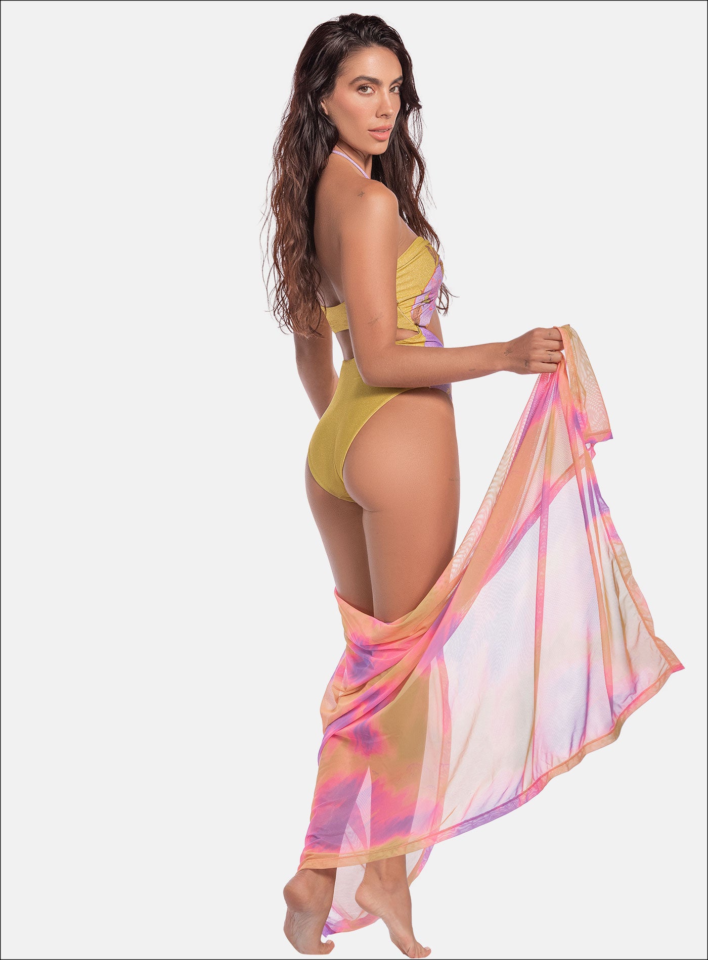 47% POLIÉSTER 37% LUREX 16% ELASTANO ELÁSTICO INTERNO PARA MEJOR AJUSTE tela con diseño sublimado localizado, tejido liviano, translúcida y ligeramente áspera al tacto