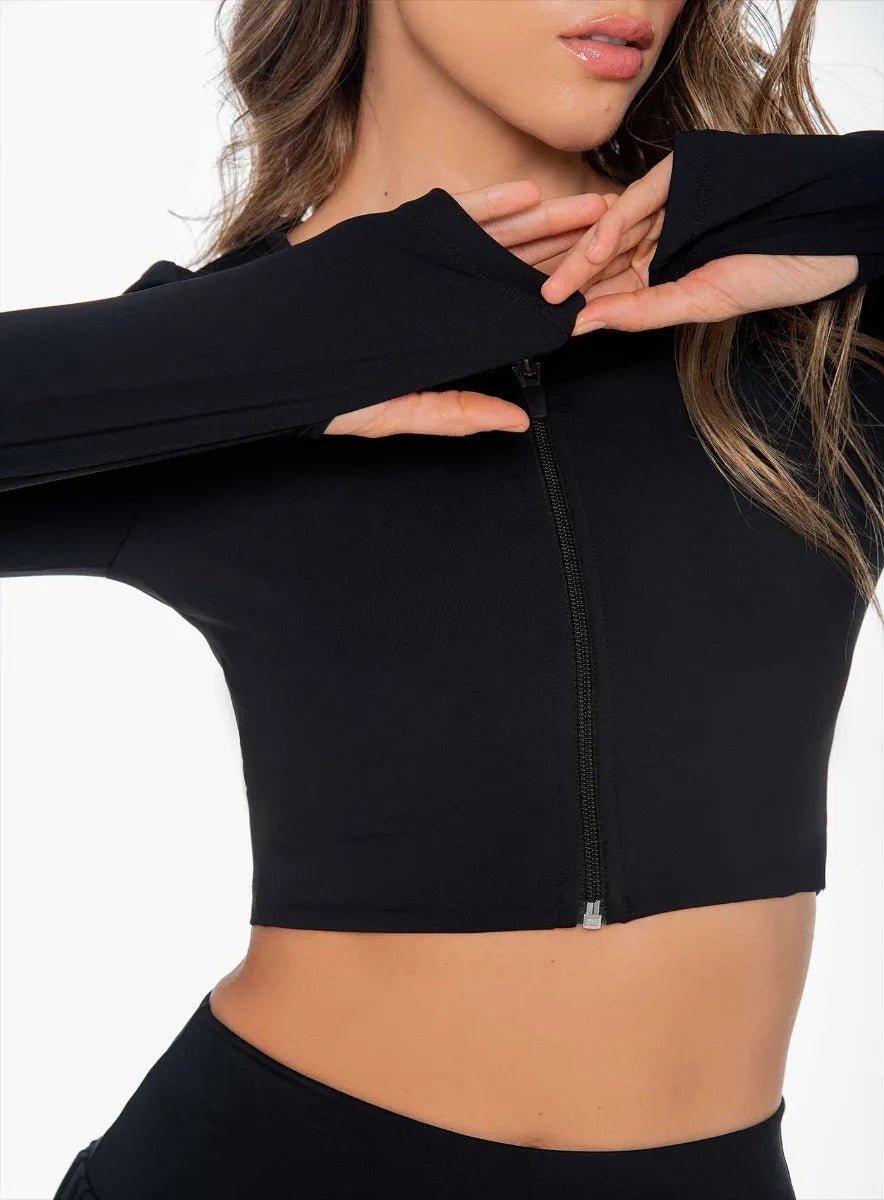 BLUSA DEPORTIVA MANGA LARGA CON CIERRE EN EL FRENTE Y PUÑOS EXTENDIDOS PARA DARLE ABERTURA EN EL PULGAR